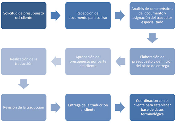PROCESO DE TRABAJOSomos conscientes de que las empresas requieren colaboradores que ofrezcan agilidad para adecuarse a sus necesidades. Nuestro proceso de trabajo ha sido especialmente diseñado para ofrecer la máxima calidad, respetando los plazos de entrega de nuestros clientes. Tras la recepción del documento a cotizar, analizamos sus características y seleccionamos al traductor nativo especializado para realizar la traducción y con conocimiento exhaustivo de la terminología específica de ese proyecto. Elaboramos un presupuesto ajustado y fijamos un plazo de entrega y, tras su aprobación por parte del cliente, se inicia el proceso de traducción. Antes de entregar el proyecto al cliente, la traducción pasa por un proceso de revisión que garantiza la máxima calidad. El proceso no acaba aquí, ya que contactamos con el cliente para conocer su valoración del trabajo y generar una base de datos terminológica para garantizar la coherencia de todos los proyectos.